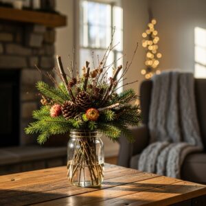 Arrange them in a mason jar or rustic vase with evergreen sprigs. Great for a countryside-inspired winter look.
