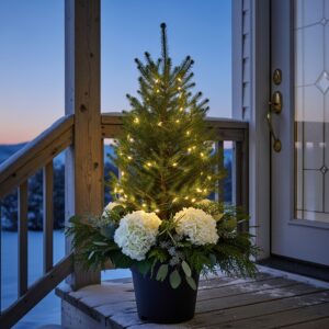 Place a small evergreen tree in a large pot and decorate its base with winter flowers like faux white hydrangeas, eucalyptus, and cedar.