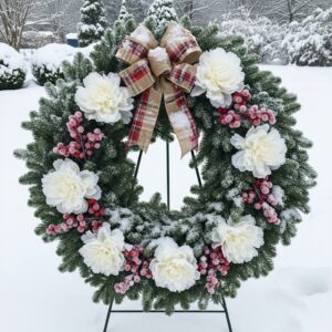 Add winter flowers such as white peonies (silk), frosted berries, and a winter bow for personality.