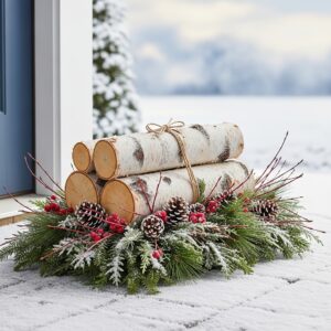 Bundle three birch logs together and surround them with a thick bed of evergreen branches, snowy pinecones, and red dogwood twigs.
