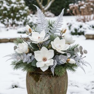 The large magnolia petals stand out beautifully in winter weather and pair well with silver-dusted eucalyptus or icy fern stems.
