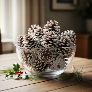 Collect pinecones, lightly spray them with white paint or faux snow, and place them in a bowl, tray, or glass vase.