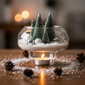 Flip a small clear bowl upside down over tiny trees or figurines, sprinkle faux snow inside, and place a candle on top.