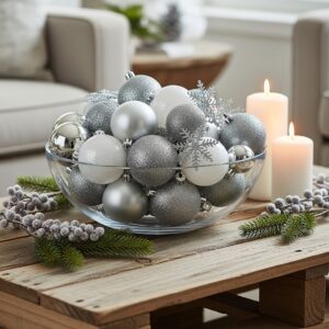 This simple centerpiece adds instant winter shine and looks great on coffee tables or dining tables.