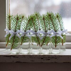 Fill small glass bottles or jars with water, drop a tiny evergreen sprig inside, and add a white ribbon around the top.
