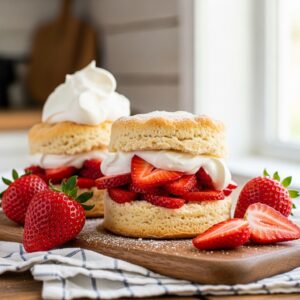 Soft shortcake biscuits paired with fresh strawberries and whipped cream.