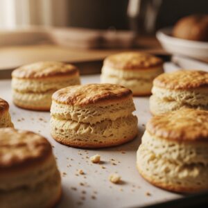 Cut biscuits, bake at 425°F (220°C) for 12–15 minutes.