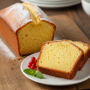 Rich and buttery cake with a tight, moist crumb and a subtle tang.