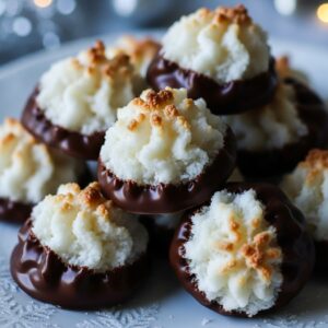 Chewy coconut macaroons dipped in dark chocolate make a tropical yet festive holiday treat.