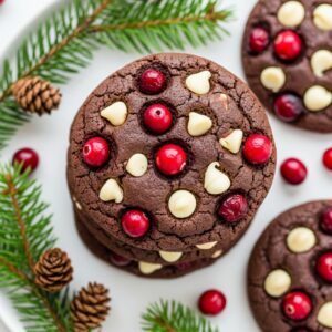 Sweet white chocolate and tart dried cranberries bring festive flavor and color to a soft chocolate-based cookie.