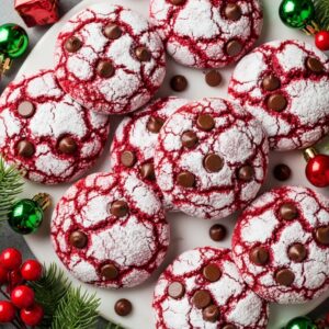 These vibrant red cookies with semi-sweet chocolate chips offer the flavor of red velvet cake in cookie form.