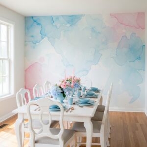 Choose watercolor wallpaper or paint one wall using diluted pastel paints.