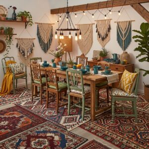 For a relaxed bohemian twist, mix vibrant tablecloths, patterned seat cushions, and colorful wall hangings.
