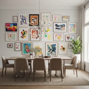 Mix framed abstract paintings, watercolor pieces, and even children’s coloring pages for a personalized look.