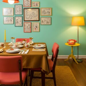Bring old-school charm to your coloring dining room with retro hues like mustard, mint, and coral.