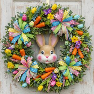 For a fun and cheerful Easter look, a bunny wreath featuring carrots adds instant personality.