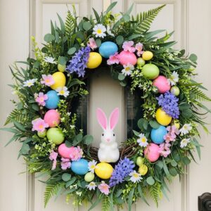 Combining a bunny motif with Easter eggs creates a wreath that feels classic and symbolic of the holiday.