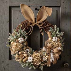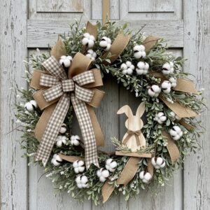 This design often features a neutral wreath base accented with faux cotton stems, burlap bows, and a subtle bunny element such as ears or a small wooden cutout.