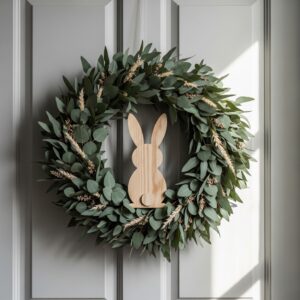 This style typically features a simple wooden bunny cutout mounted at the center of a neutral wreath base made from eucalyptus or olive branches.