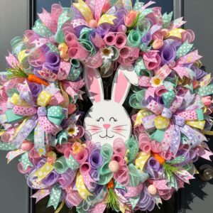 Deco mesh bunny wreaths are bold, colorful, and full of volume, making them ideal for festive Easter displays.