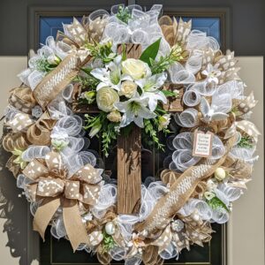 This wreath feels both elegant and spiritual, suitable for front doors or indoor displays.