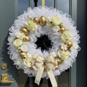 For a more sophisticated look, a white and gold deco mesh wreath offers timeless elegance.