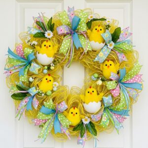 A chick-themed deco mesh wreath is cheerful and playful, especially appealing for homes with kids.