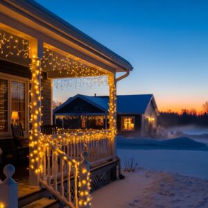 Wrap warm white or colored string lights around porch railings, columns, and roof edges.