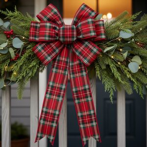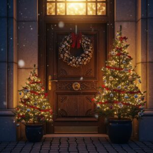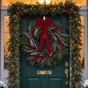 A timeless choice, a fresh evergreen wreath with pinecones, berries, and a big red bow instantly transforms your door into a holiday centerpiece.