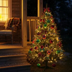 Use LED lights, plastic or shatterproof ornaments, and weather-resistant ribbons.