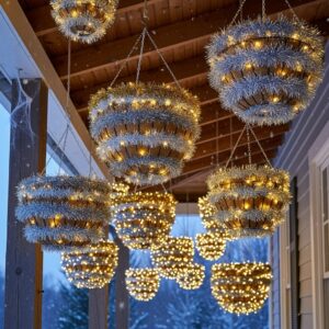Turn hanging baskets into oversized ornaments by flipping them upside down, wrapping them with lights and tinsel, and suspending them from porch beams.