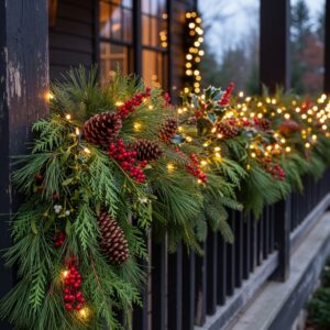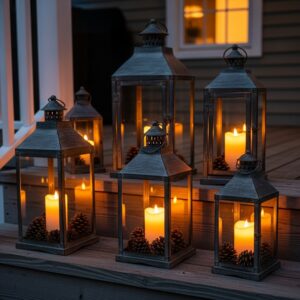 Arrange lanterns of varying sizes on steps or porch corners. Fill them with LED candles, pinecones, or small ornaments for a cozy ambiance.