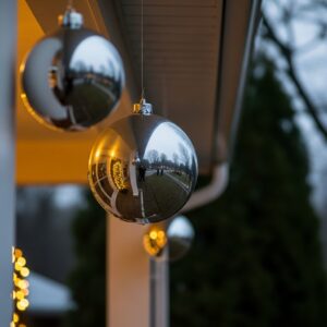 Hang large waterproof ornaments from the porch ceiling or nearby tree branches.