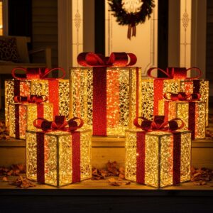 Create glowing gift boxes using wooden frames or crates wrapped with string lights and topped with festive bows.