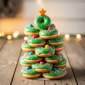 Frosted donuts with green icing and colorful sprinkles arranged in a tree shape.