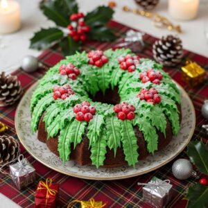 A show-stopping dessert shaped like a Christmas wreath. Decorate with red berries (candied or real) and green frosting leaves.