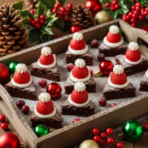 Mini brownies topped with whipped cream and a strawberry instantly become adorable Santa hats.