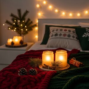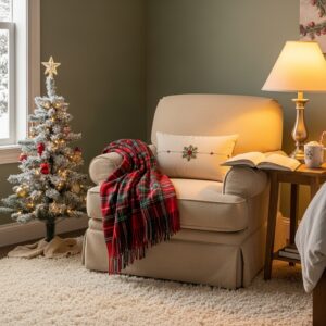 If space allows, transform a corner of your bedroom into a winter reading nook with a comfy chair, plaid blanket, small Christmas tree, and soft lighting.