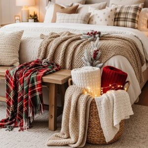 Adding a holiday blanket, festive bench décor, or a wicker basket filled with plush throws creates a cozy, styled look at the end of your bed.