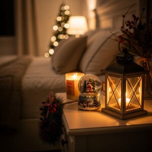 Add small décor pieces such as a mini lantern, snow globe, Christmas candle, or a festive mug.