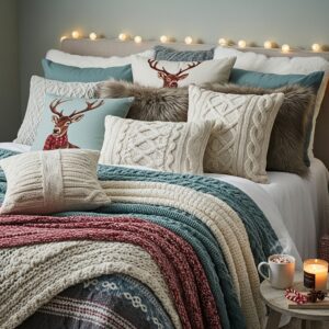 Swap your everyday pillows for seasonal ones featuring reindeer, snowflakes, or cozy textures like cable-knit and faux fur.