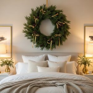 A wreath isn’t just for the front door. Hanging one above your headboard adds instant sophistication and holiday charm.