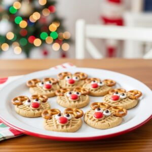Turn simple peanut butter cookies into adorable reindeer faces using pretzel antlers, chocolate chip eyes, and red candy noses.