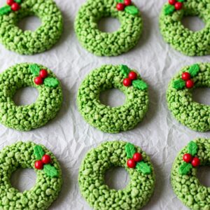 A nostalgic Christmas classic! Melt marshmallows and butter, tint the mixture green, then stir in Rice Krispies to form into small wreath shapes.