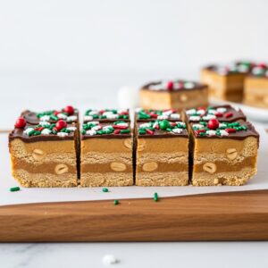 These layered bars start with a peanut butter–oat mixture pressed into a pan, topped with a smooth chocolate layer. Slice into bars and decorate with holiday sprinkles.
