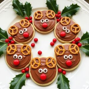Use pretzels for antlers, chocolate chips for eyes, and a red candy or icing for Rudolph’s nose.