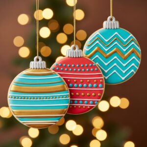 Use round cutters and decorate with bold patterns: stripes, dots, chevrons, glitter bands, or metallic accents.