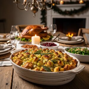 A cozy blend of bread cubes, herbs, and veggies baked until golden on top.