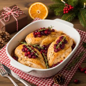 Sweet, tangy chicken topped with cranberries and herbs—easy yet festive.
