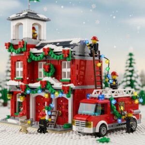 Include firefighter minifigures hanging Christmas lights or enjoying cocoa together.